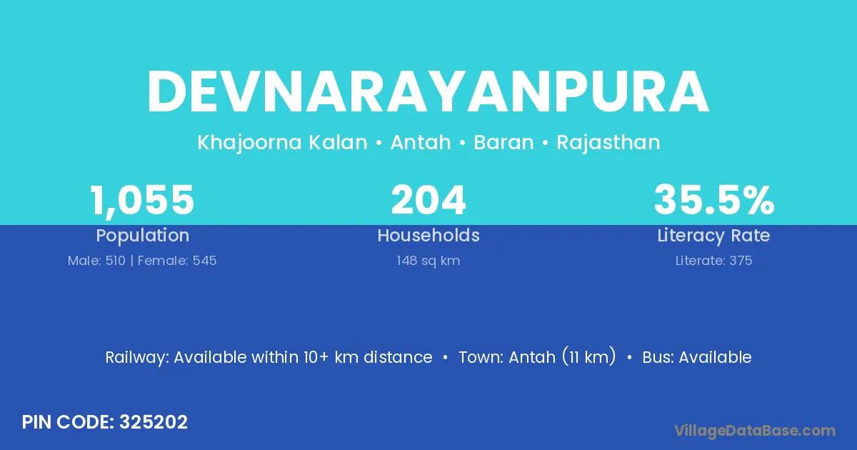 Antah (11 km) is the nearest town to Devnarayanpura village for major economic activities and is located approximately 11 km away.