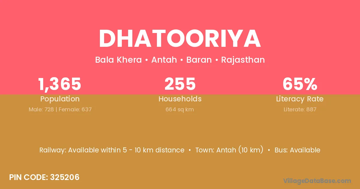 Dhatooriya village has a total population of 1,365 people, of which 728 are males and 637 are females.