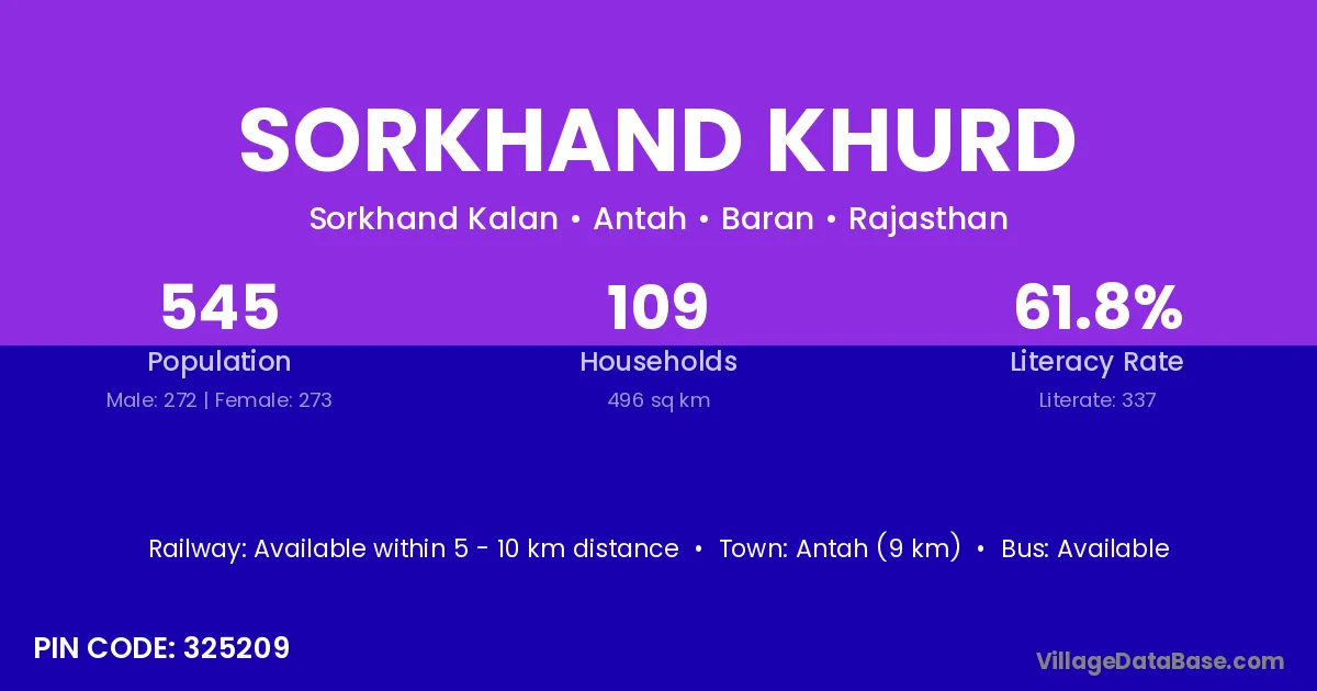 Antah (9 km) is the nearest town to Sorkhand Khurd village for major economic activities and is located approximately 9 km away.