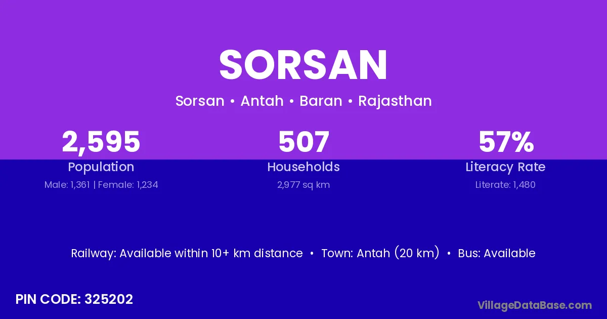 Antah (20 km) is the nearest town to Sorsan village for major economic activities and is located approximately 20 km away.