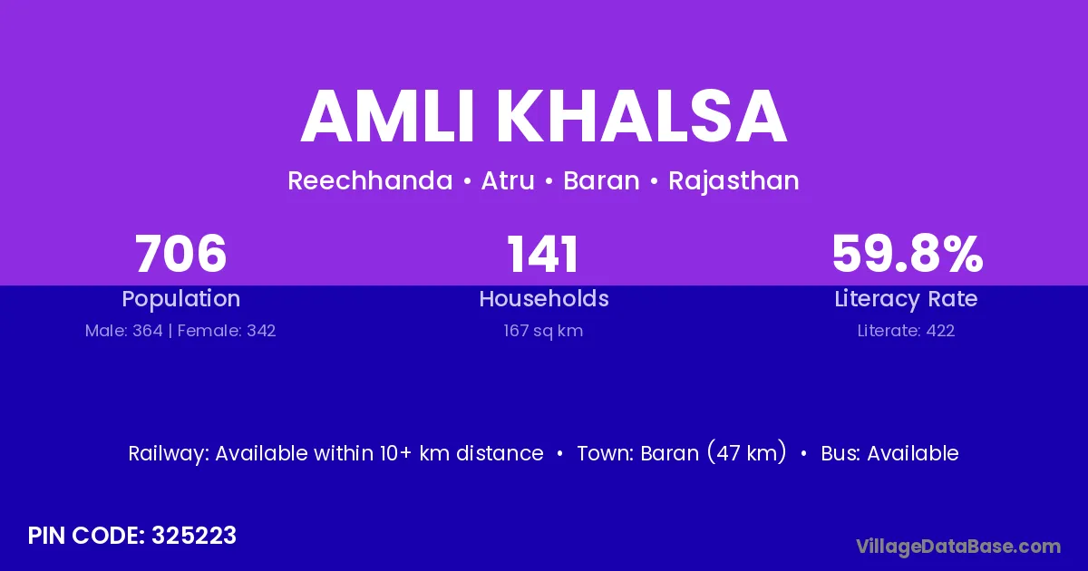 Baran (47 km) is the nearest town to Amli Khalsa village for major economic activities and is located approximately 47 km away.