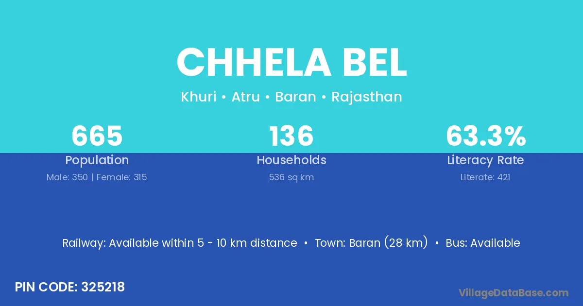 Baran (28 km) is the nearest town to Chhela Bel village for major economic activities and is located approximately 28 km away.