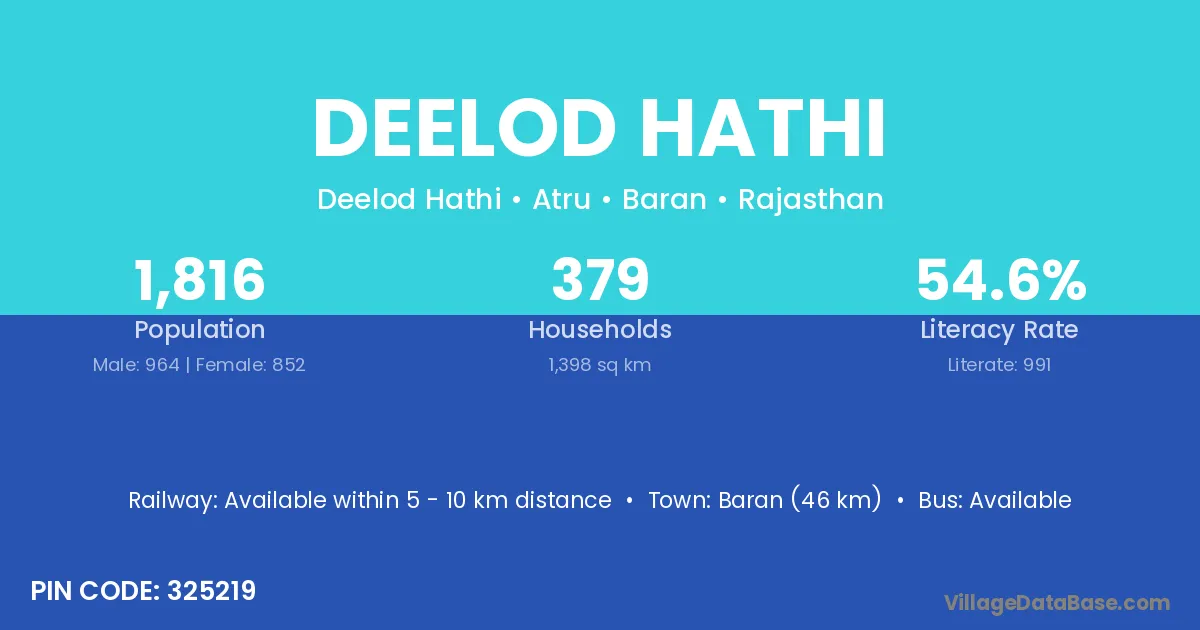 Baran (46 km) is the nearest town to Deelod Hathi village for major economic activities and is located approximately 46 km away.