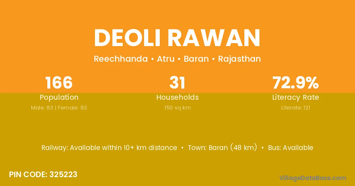Baran (48 km) is the nearest town to Deoli Rawan village for major economic activities and is located approximately 48 km away.