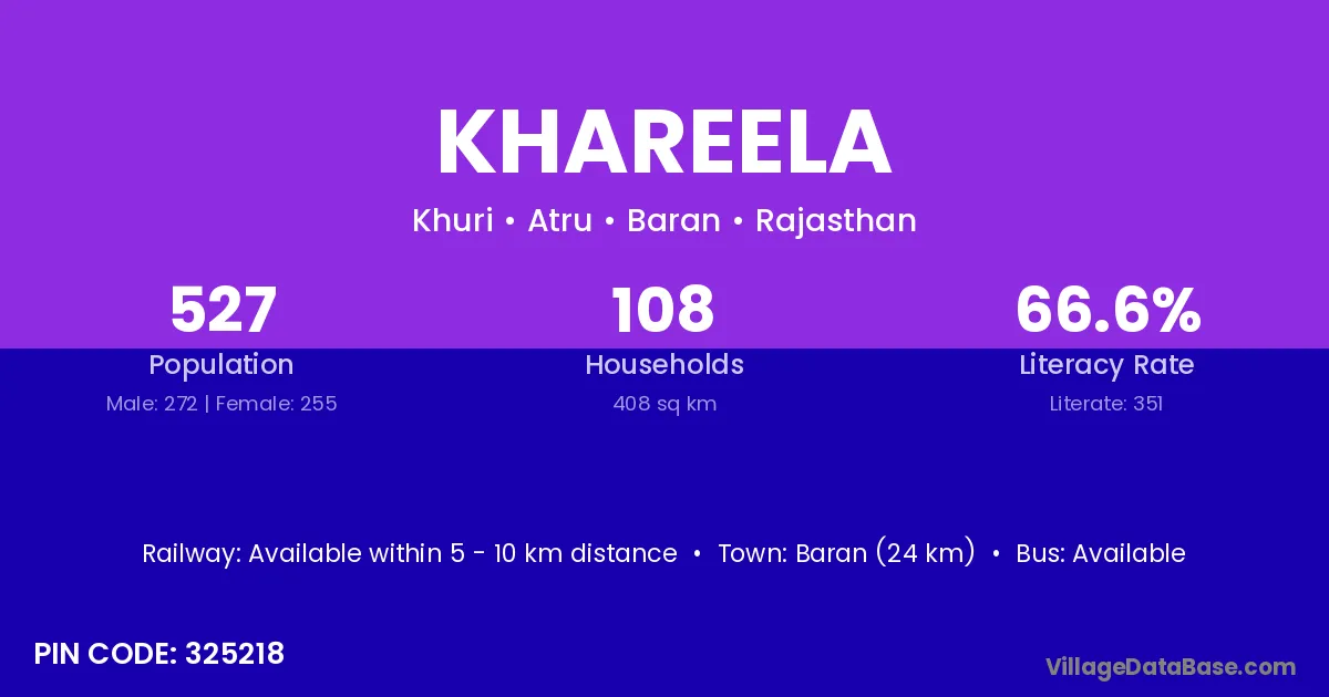 Baran (24 km) is the nearest town to Khareela village for major economic activities and is located approximately 24 km away.