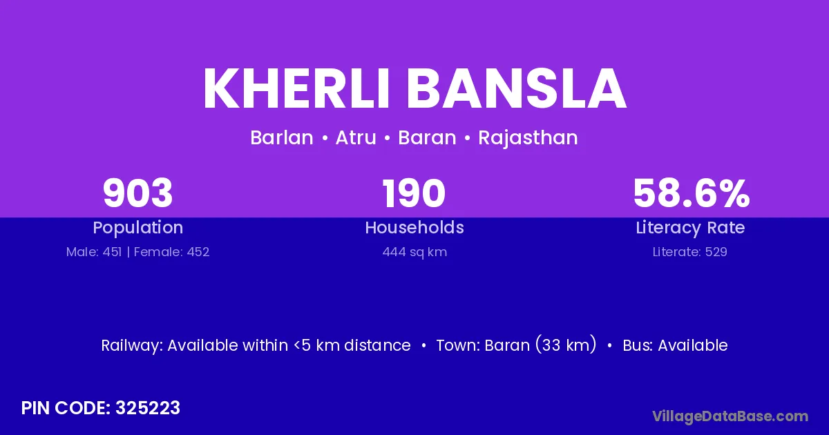 Baran (33 km) is the nearest town to Kherli Bansla village for major economic activities and is located approximately 33 km away.