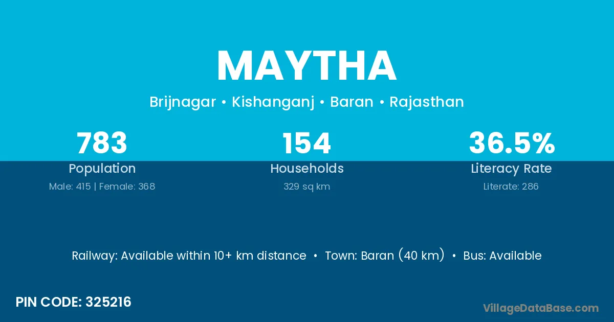 Baran (31 km) is the nearest town to Maytha village for major economic activities and is located approximately 31 km away.