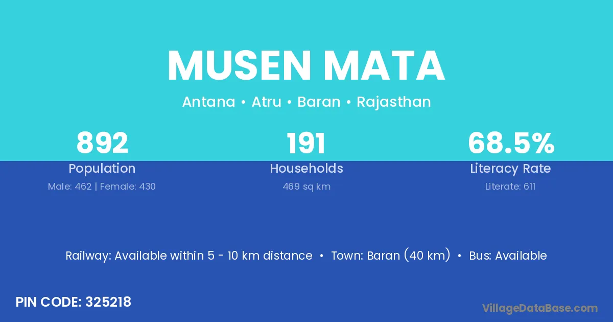 Baran (40 km) is the nearest town to Musen Mata village for major economic activities and is located approximately 40 km away.