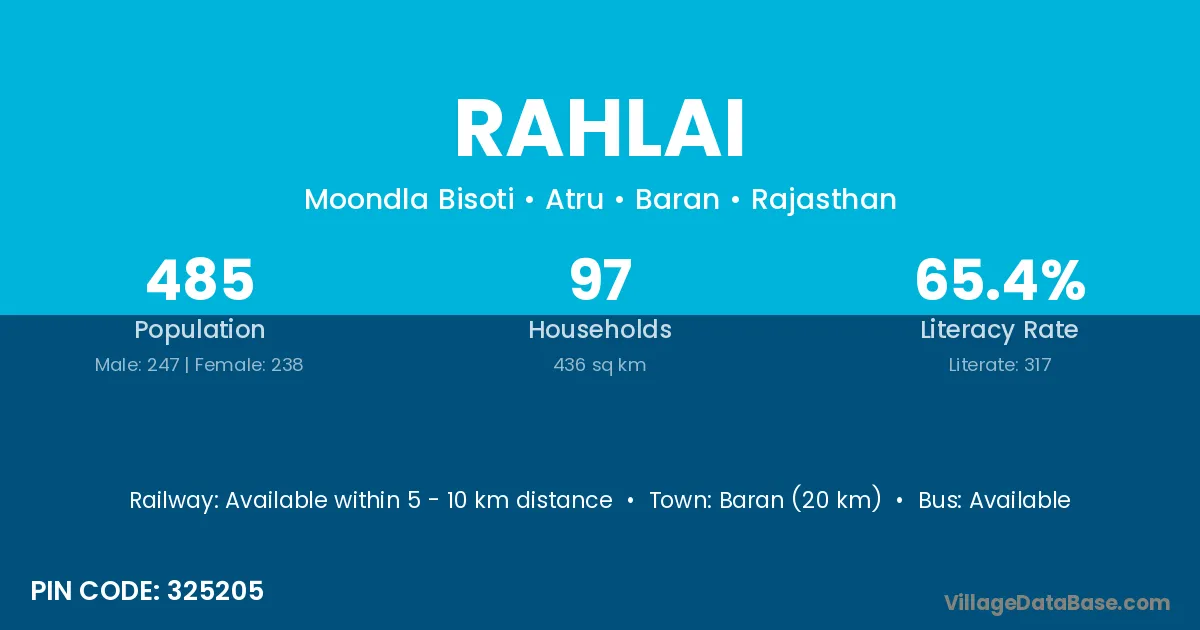 Baran (20 km) is the nearest town to Rahlai village for major economic activities and is located approximately 20 km away.