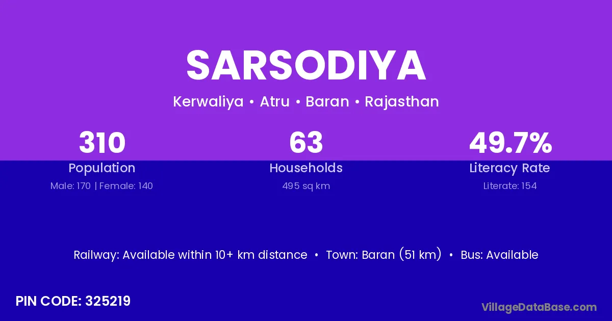 Baran (51 km) is the nearest town to Sarsodiya village for major economic activities and is located approximately 51 km away.