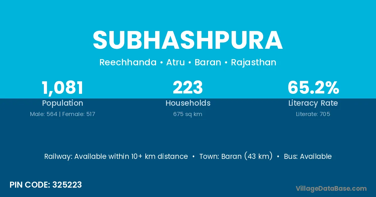 Baran (43 km) is the nearest town to Subhashpura village for major economic activities and is located approximately 43 km away.