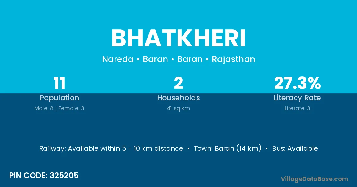 Baran (14 km) is the nearest town to Bhatkheri village for major economic activities and is located approximately 14 km away.