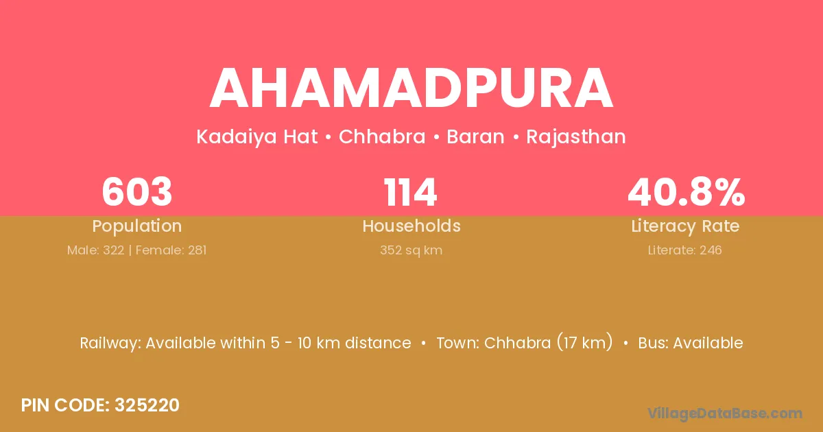 Chhabra (17 km) is the nearest town to Ahamadpura village for major economic activities and is located approximately 17 km away.