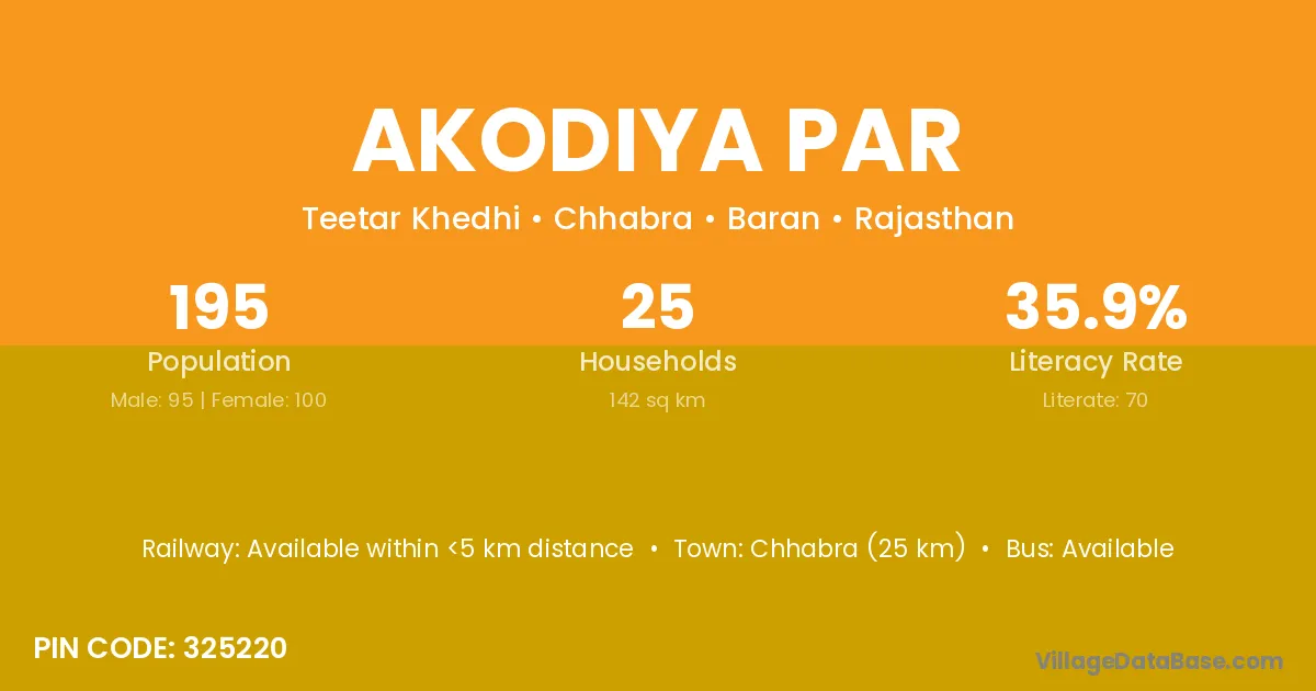 Chhabra (25 km) is the nearest town to Akodiya Par village for major economic activities and is located approximately 25 km away.