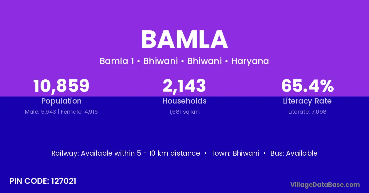 The literacy rate of Bamla village is 36.13%. Male literacy stands at 43.23% and female literacy at 28.66%.