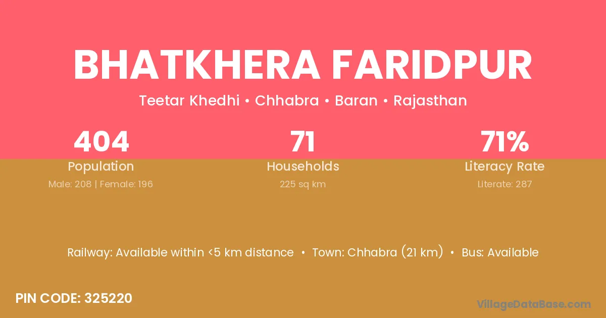 Chhabra (21 km) is the nearest town to Bhatkhera Faridpur village for major economic activities and is located approximately 21 km away.
