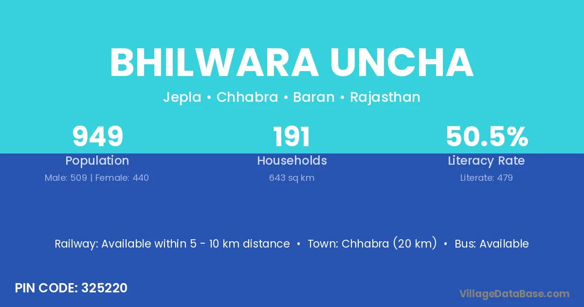 Bhilwara Uncha village has a total population of 949 people, of which 509 are males and 440 are females.