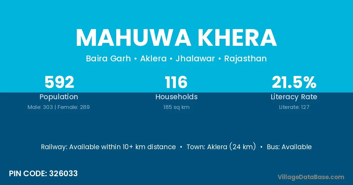 Chhabra (15 km) is the nearest town to Mahuwa Khera village for major economic activities and is located approximately 15 km away.