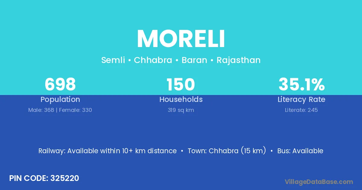 Chhabra (15 km) is the nearest town to Moreli village for major economic activities and is located approximately 15 km away.