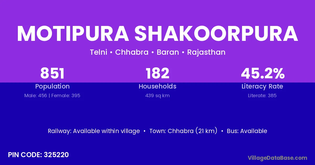 Chhabra (21 km) is the nearest town to Motipura Shakoorpura village for major economic activities and is located approximately 21 km away.