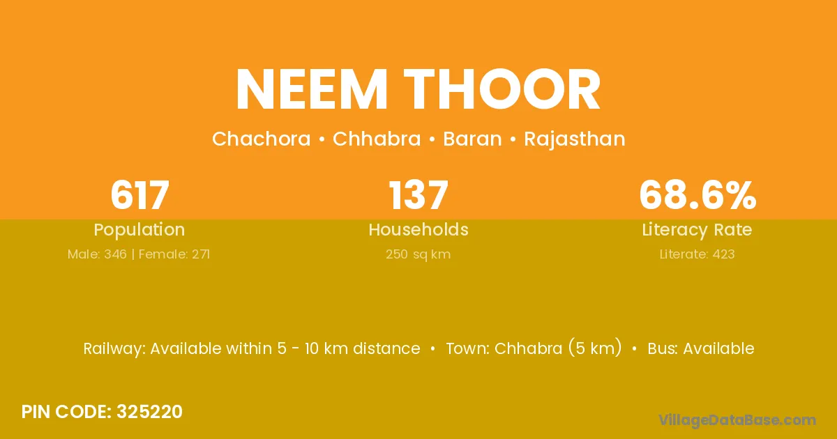Chhabra (5 km) is the nearest town to Neem Thoor village for major economic activities and is located approximately 5 km away.