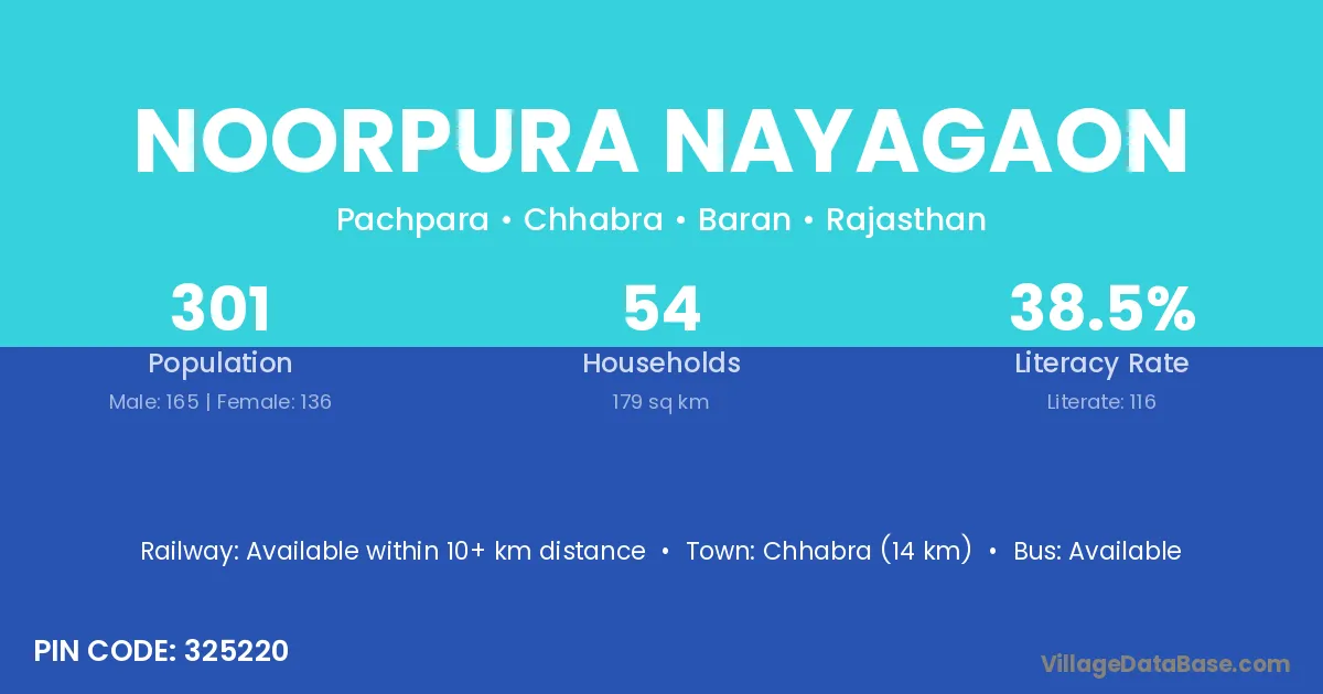 Chhabra (14 km) is the nearest town to Noorpura Nayagaon village for major economic activities and is located approximately 14 km away.