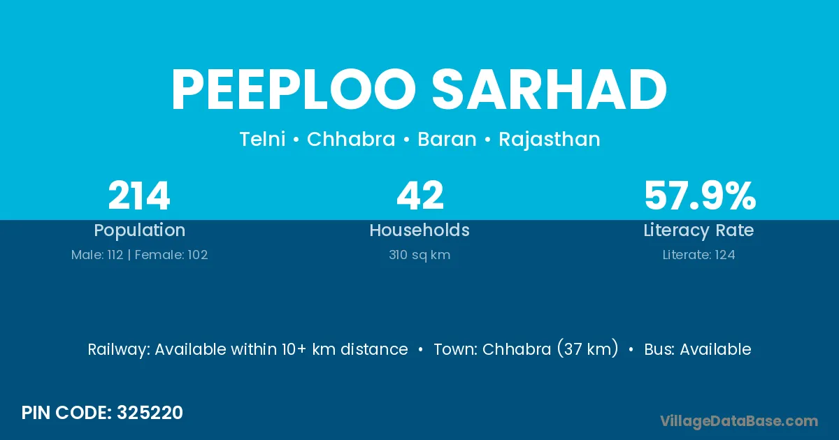 Chhabra (37 km) is the nearest town to Peeploo Sarhad village for major economic activities and is located approximately 37 km away.