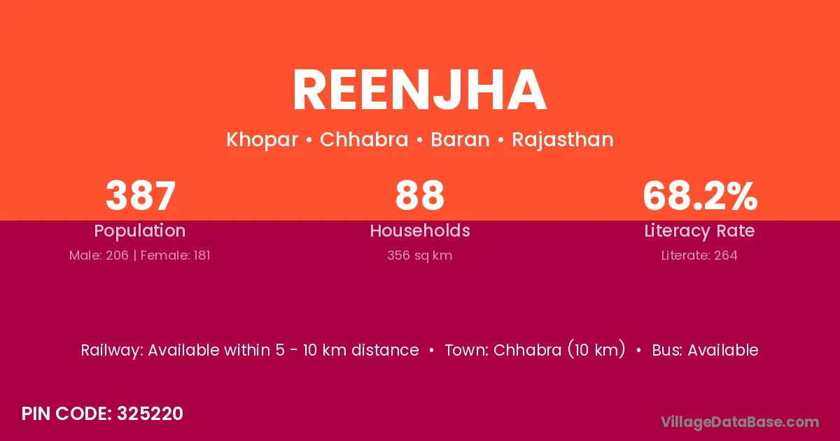 Chhabra (10 km) is the nearest town to Reenjha village for major economic activities and is located approximately 10 km away.