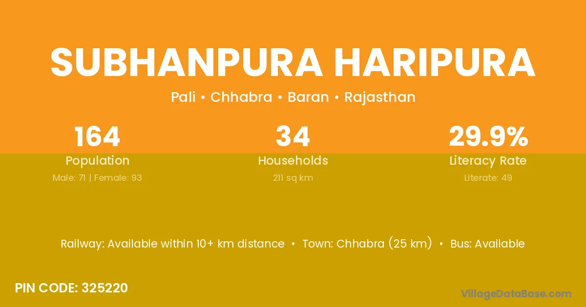 Chhabra (25 km) is the nearest town to Subhanpura Haripura village for major economic activities and is located approximately 25 km away.