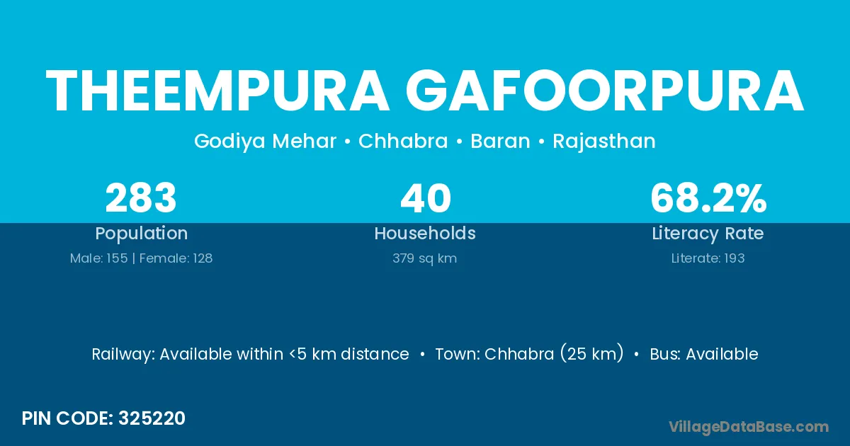 Chhabra (25 km) is the nearest town to Theempura Gafoorpura village for major economic activities and is located approximately 25 km away.