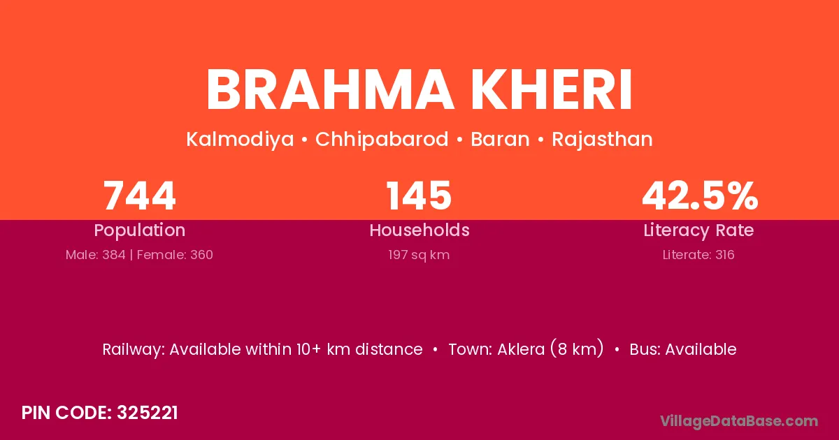 Aklera (8 km) is the nearest town to Brahma Kheri village for major economic activities and is located approximately 8 km away.