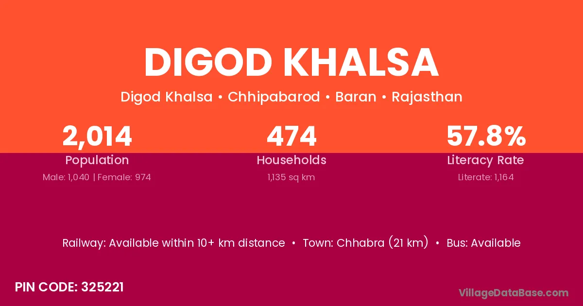 Chhabra (21 km) is the nearest town to Digod Khalsa village for major economic activities and is located approximately 21 km away.