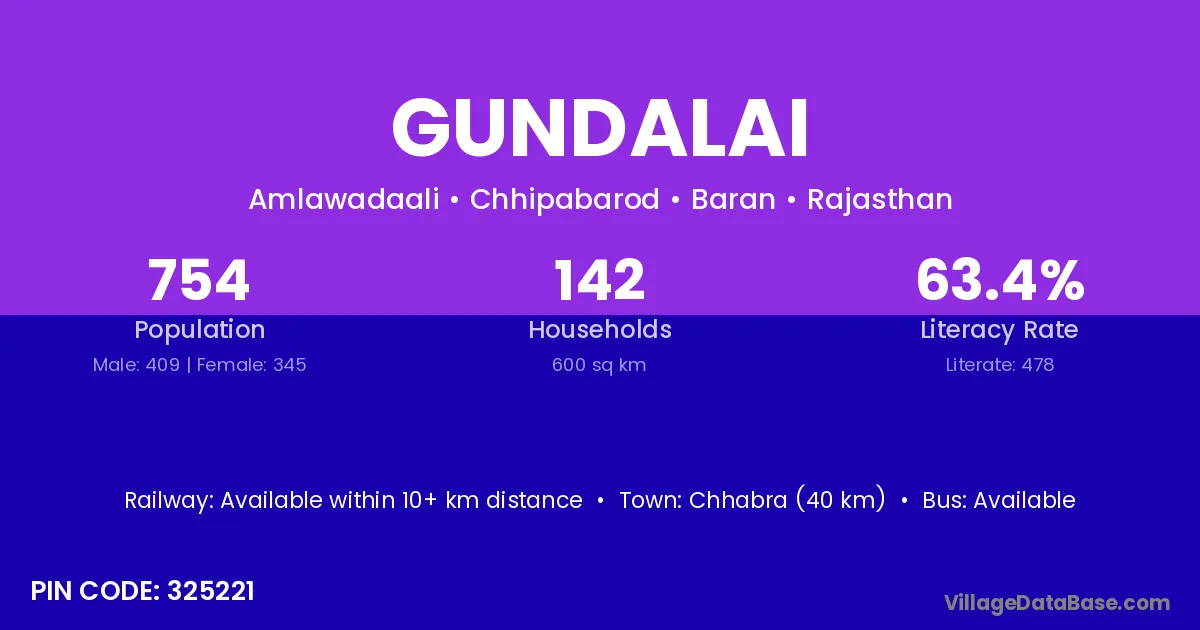 Chhabra (40 km) is the nearest town to Gundalai village for major economic activities and is located approximately 40 km away.