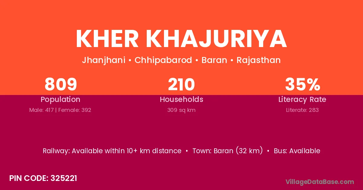 Baran (32 km) is the nearest town to Kher Khajuriya village for major economic activities and is located approximately 32 km away.