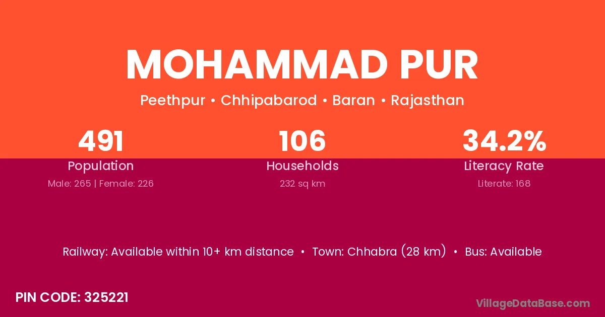 Chhabra (28 km) is the nearest town to Mohammad Pur village for major economic activities and is located approximately 28 km away.