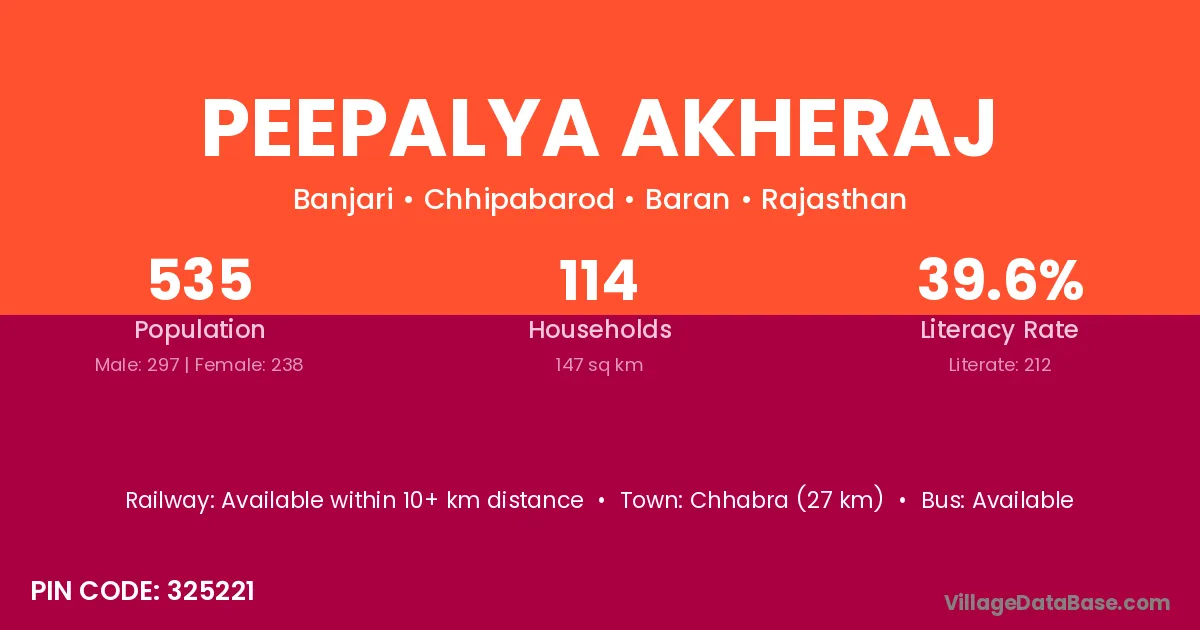 Chhabra (27 km) is the nearest town to Peepalya Akheraj village for major economic activities and is located approximately 27 km away.