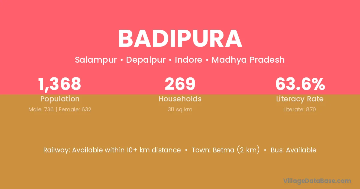 Baran (65 km) is the nearest town to Badipura village for major economic activities and is located approximately 65 km away.