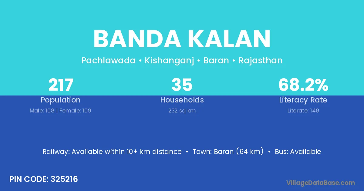 Baran (64 km) is the nearest town to Banda Kalan village for major economic activities and is located approximately 64 km away.