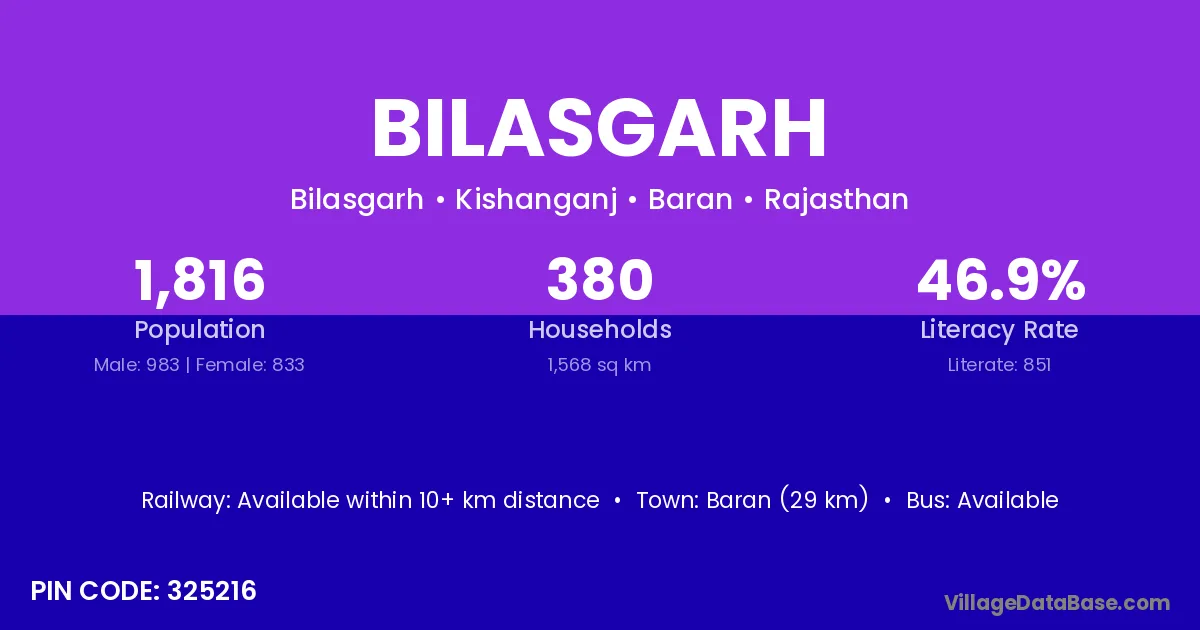 Baran (29 km) is the nearest town to Bilasgarh village for major economic activities and is located approximately 29 km away.