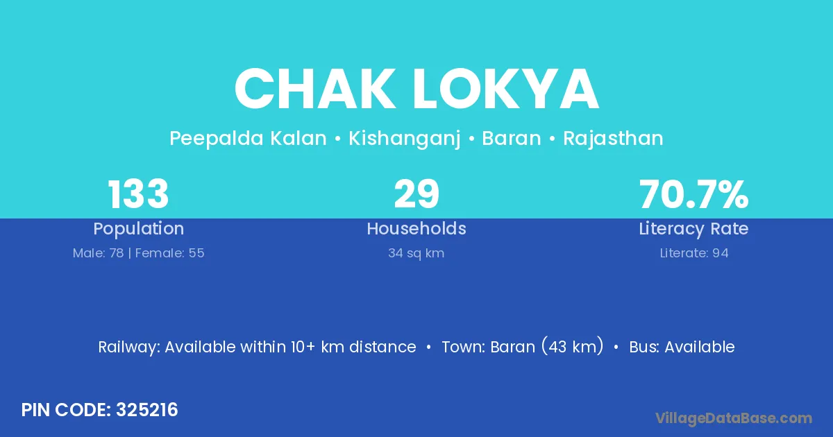 Baran (43 km) is the nearest town to Chak Lokya village for major economic activities and is located approximately 43 km away.