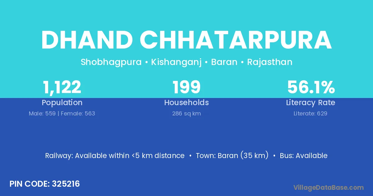 Baran (35 km) is the nearest town to Dhand Chhatarpura village for major economic activities and is located approximately 35 km away.