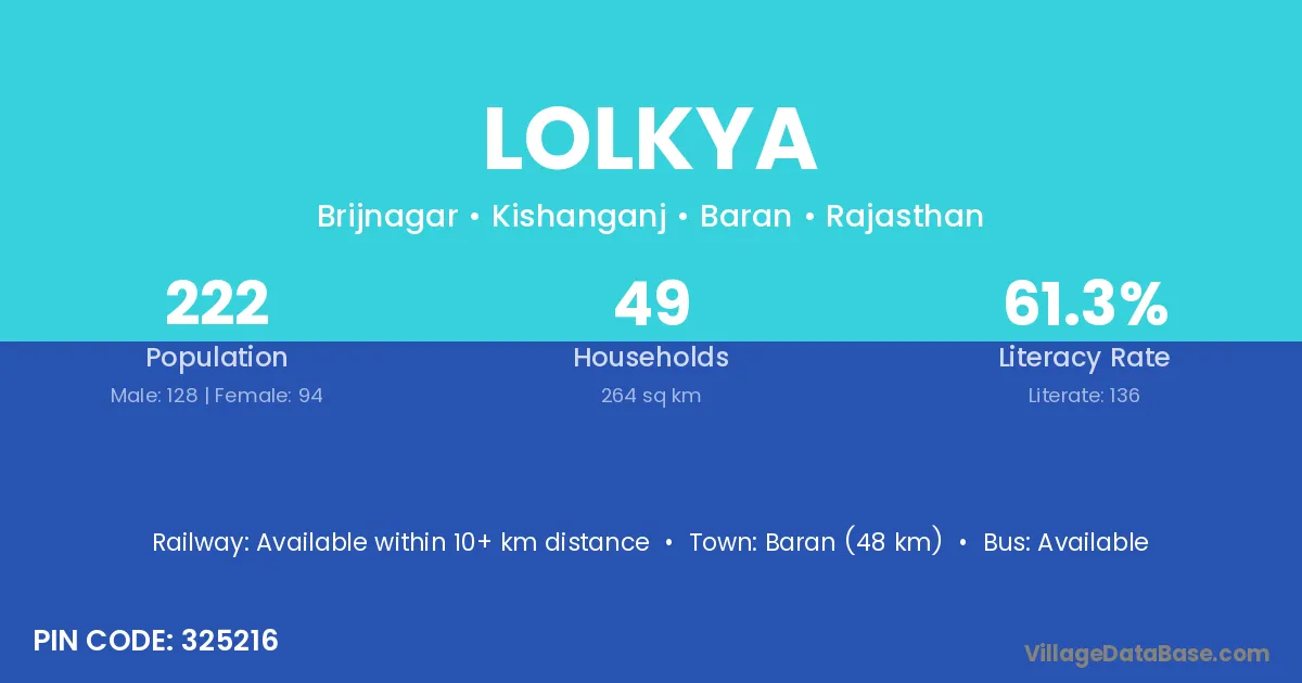 Baran (48 km) is the nearest town to Lolkya village for major economic activities and is located approximately 48 km away.