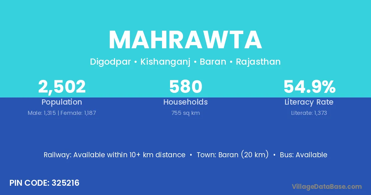 Baran (20 km) is the nearest town to Mahrawta village for major economic activities and is located approximately 20 km away.