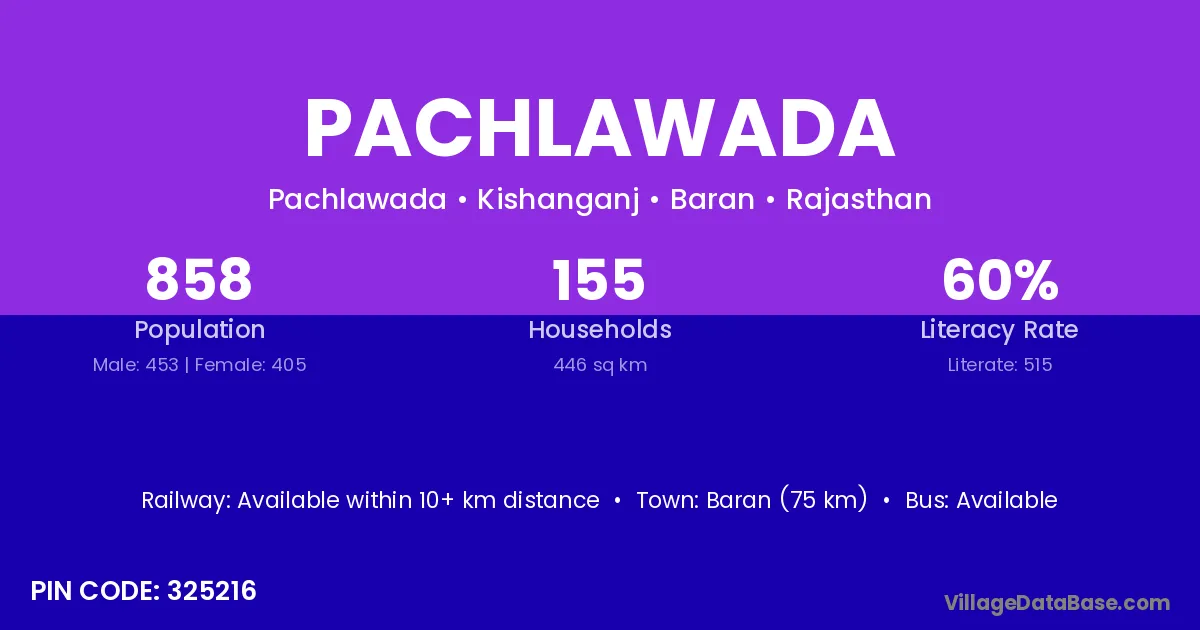 Baran (75 km) is the nearest town to Pachlawada village for major economic activities and is located approximately 75 km away.
