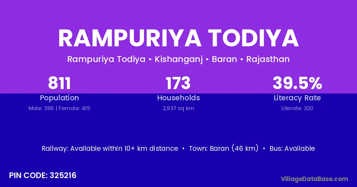 Baran (46 km) is the nearest town to Rampuriya Todiya village for major economic activities and is located approximately 46 km away.