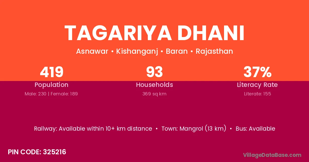 Tagariya Dhani village has a total population of 419 people, of which 230 are males and 189 are females.