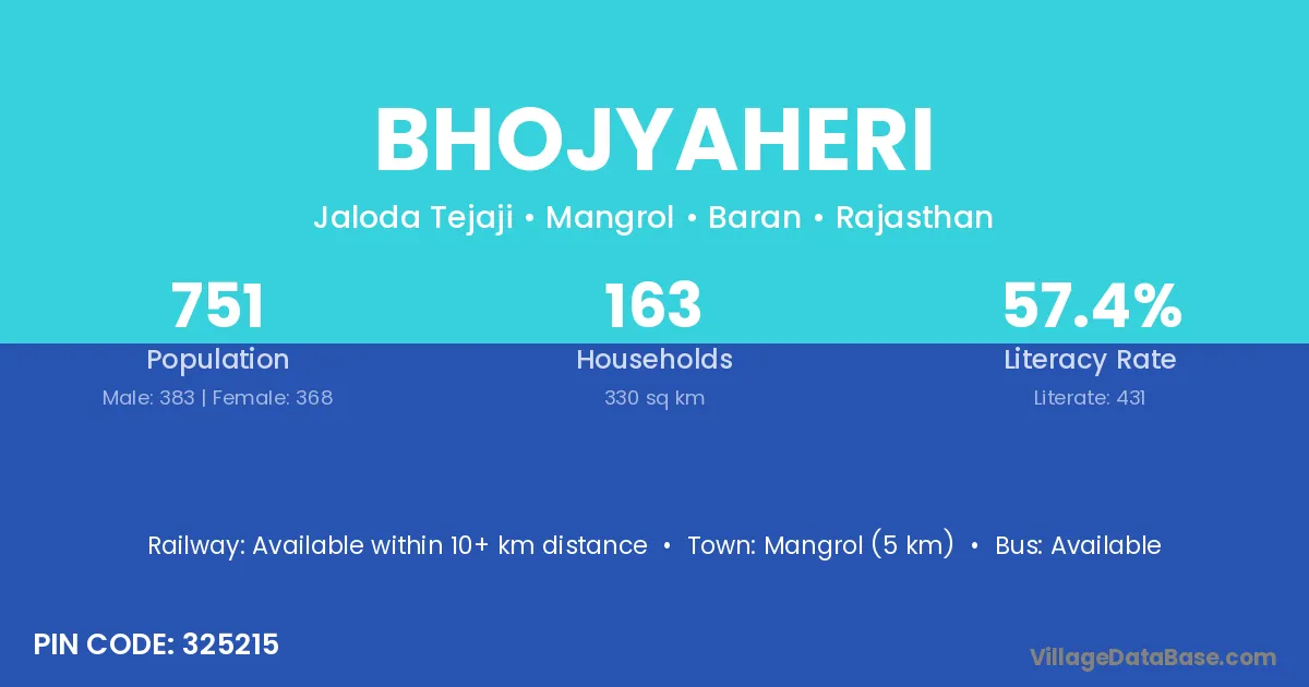 Mangrol (5 km) is the nearest town to Bhojyaheri village for major economic activities and is located approximately 5 km away.