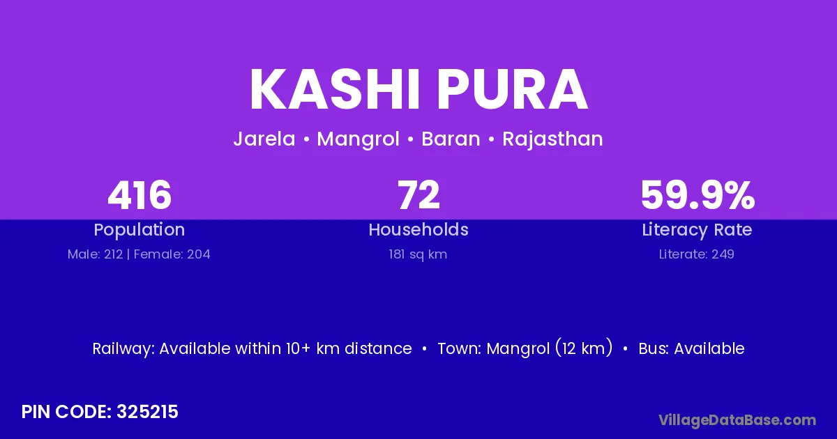 Mangrol (12 km) is the nearest town to Kashi Pura village for major economic activities and is located approximately 12 km away.