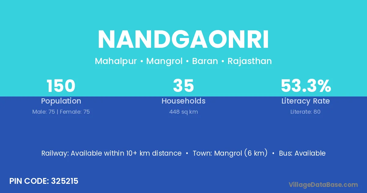 Mangrol (6 km) is the nearest town to Nandgaonri village for major economic activities and is located approximately 6 km away.