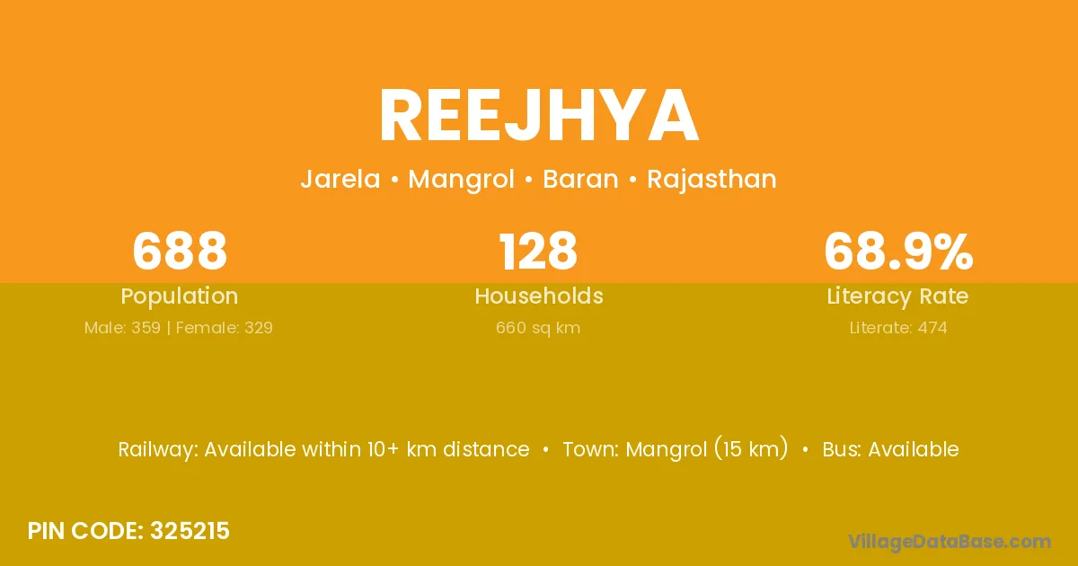 Mangrol (15 km) is the nearest town to Reejhya village for major economic activities and is located approximately 15 km away.